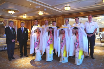 船内では、初寄港を記念した式典が開催され、記念品の交換や