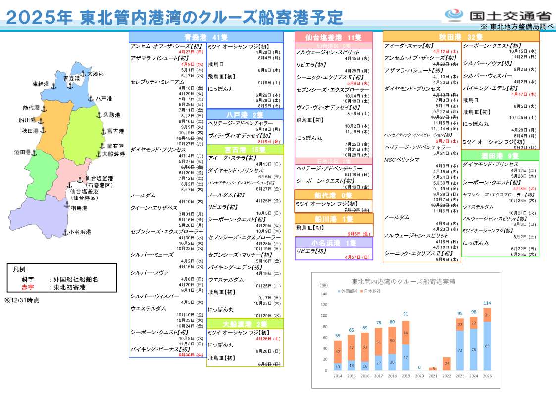 掲載している寄港予定は、更新日時点で船社HP等により販売が確認できた商品となります。(東北地方整備局調べ)