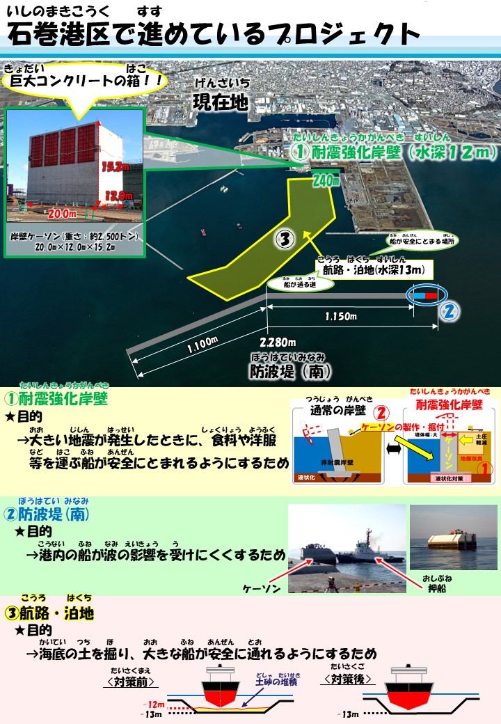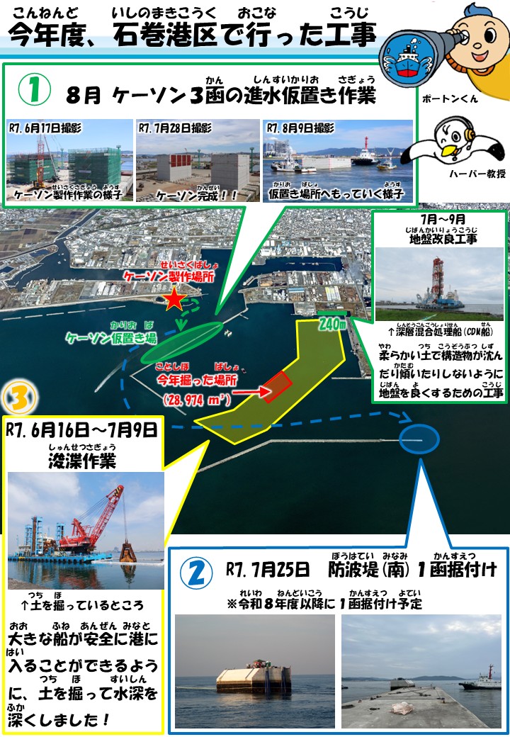 石巻港区の工事について 更新日:2025年10月21日 R7年度の工事を解説! 石巻港区でR7年度に行った工事をご紹介します!工事って具体的に「どこでしているの?」「どんなことをしているの?」「どんな効果があるの?」 そんな疑問にお答えします!
