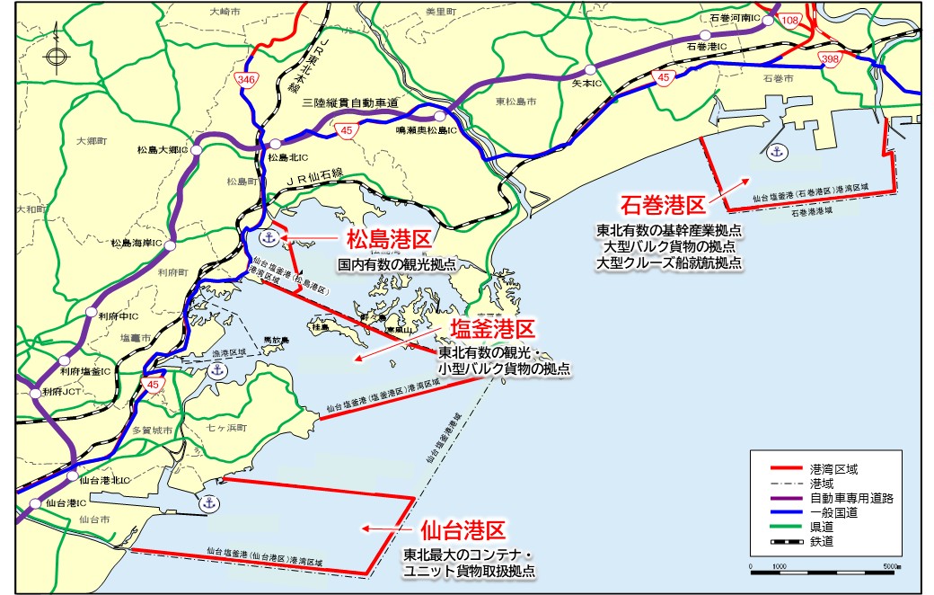 仙台塩釜港は「仙台港区」「塩釜港区」「松島港区」「石巻港区」の4つの港区からなり、東北の暮らしや産業を支える大切な港です。港では、船が安全に出入りできるように海底を掘ることで、水深を確保したり、港内を静穏に保つための防波堤や船が係船するための岸壁を作ったり、災害に強いみなとづくりを進めています。